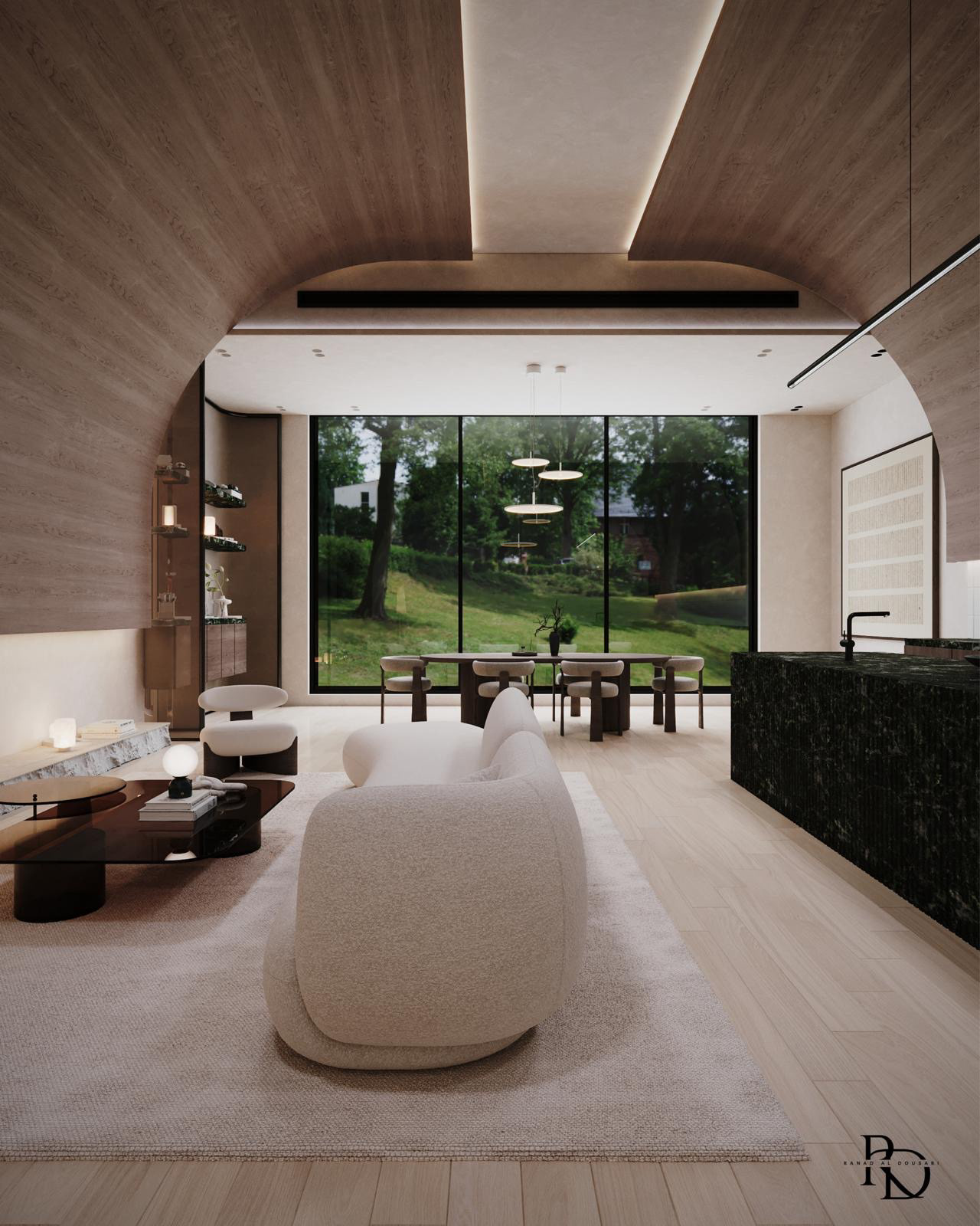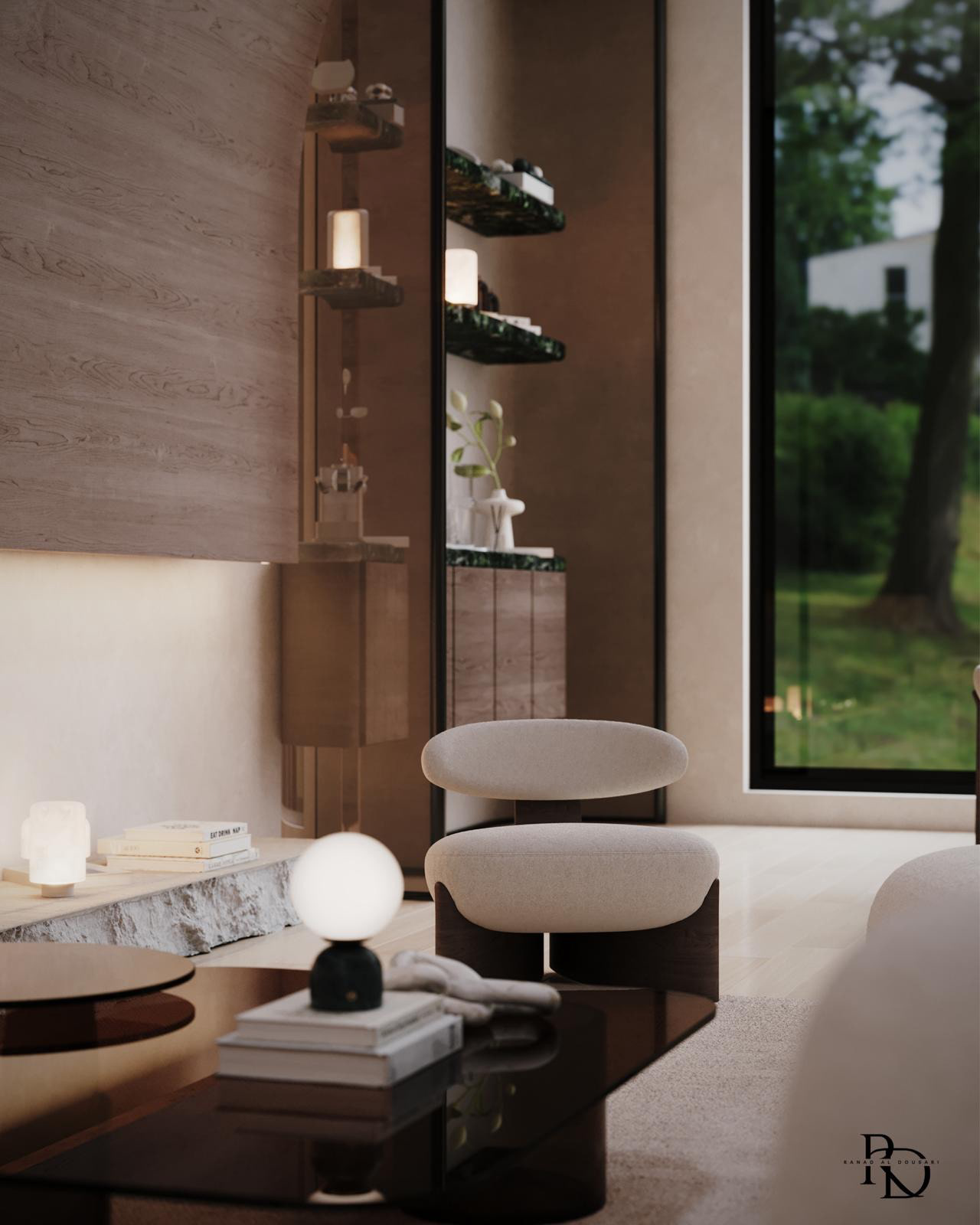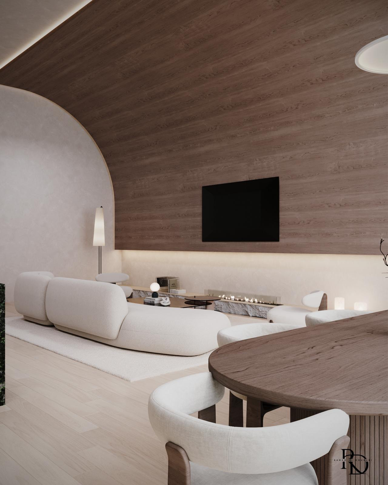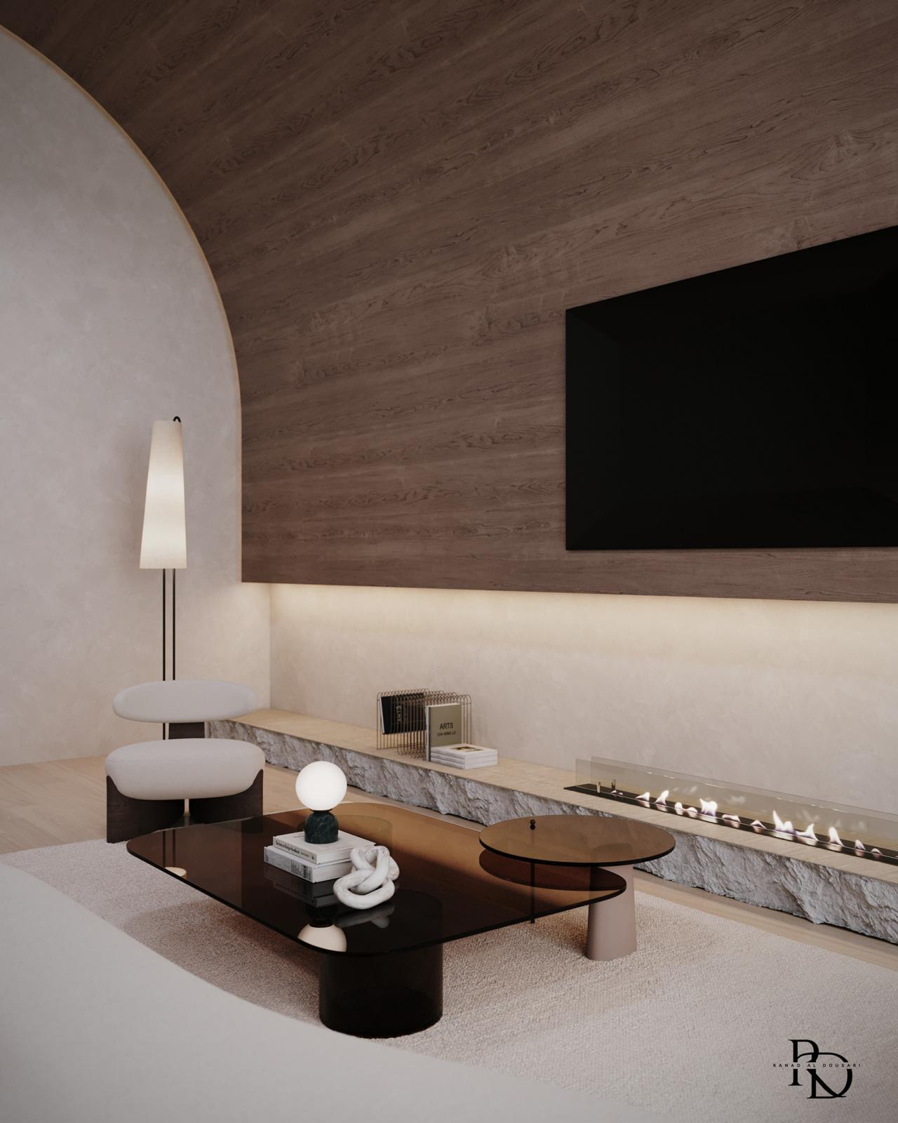Residential Project | Japandi Curves is a minimal living room where Scandinavian simplicity meets Japanese serenity. Soft curved forms flow through the space, complemented by natural oak wood, textured stone, and deep green marble accents. Together, these materials create a calm and timeless atmosphere that balances warmth, elegance, and functionality.