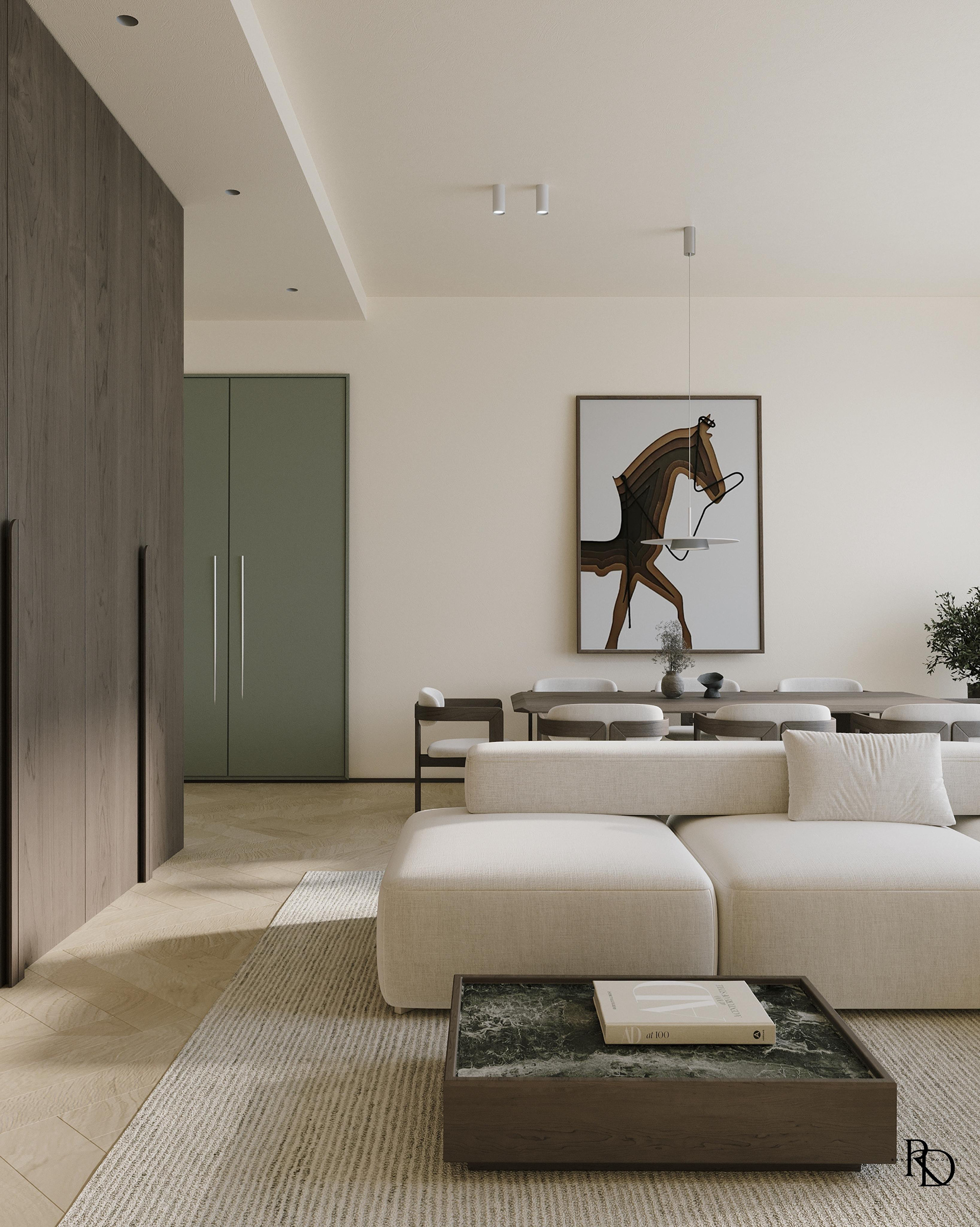 Residential Project | A serene open-space concept designed with a soft, neutral palette and natural textures. The composition blends warm wood, creamy fabrics, and curated details to create a calm, elegant atmosphere. Clean lines, negative space, and intentional decor reflect a minimalist approach that feels both refined and inviting. The abstract horse artwork anchors the dining area with character, while the dark green marble coffee table adds subtle contrast and depth.