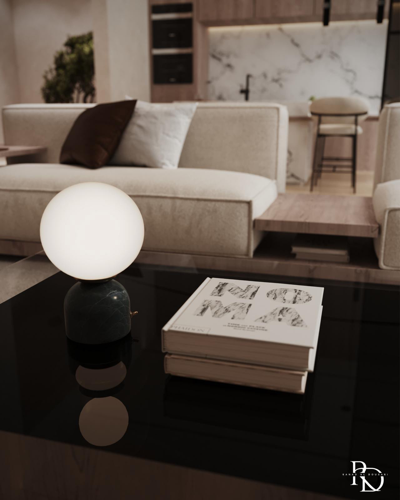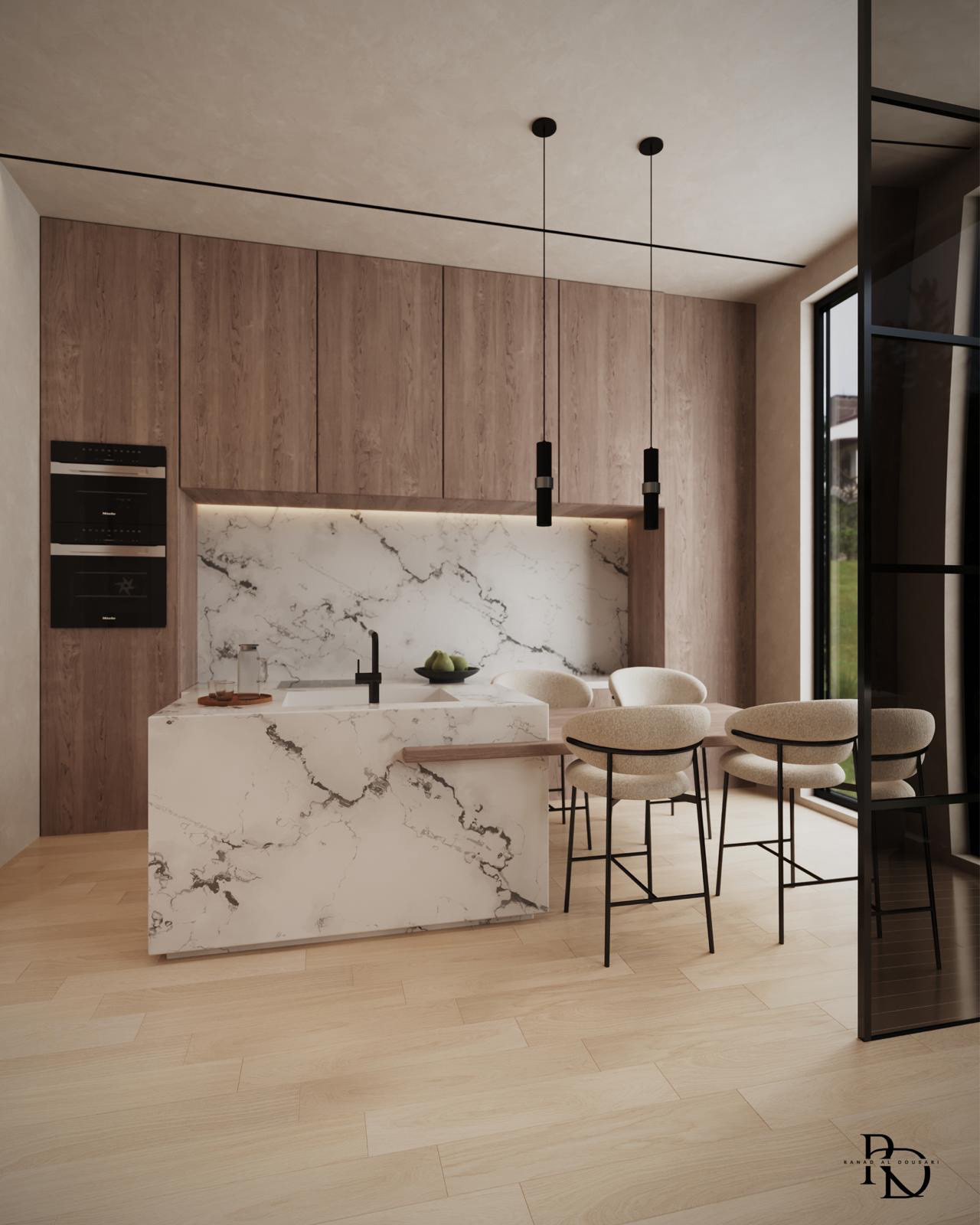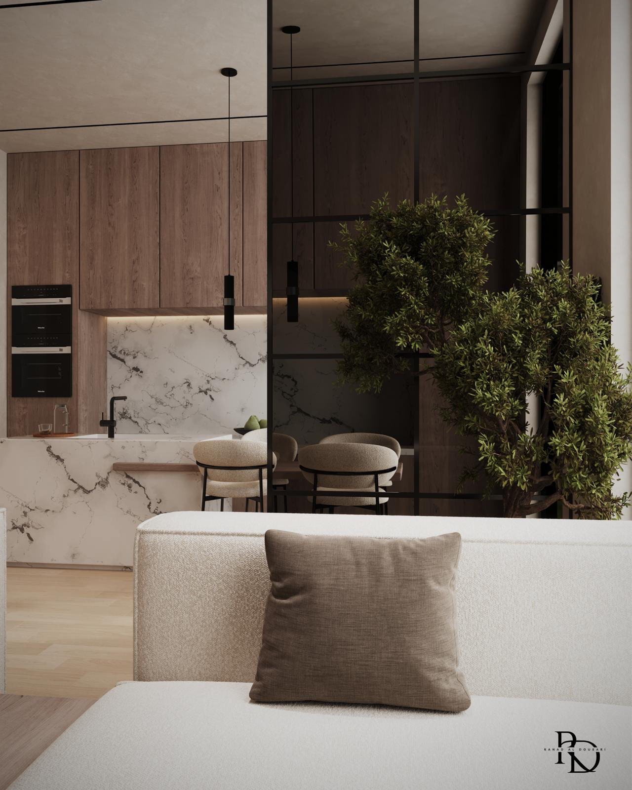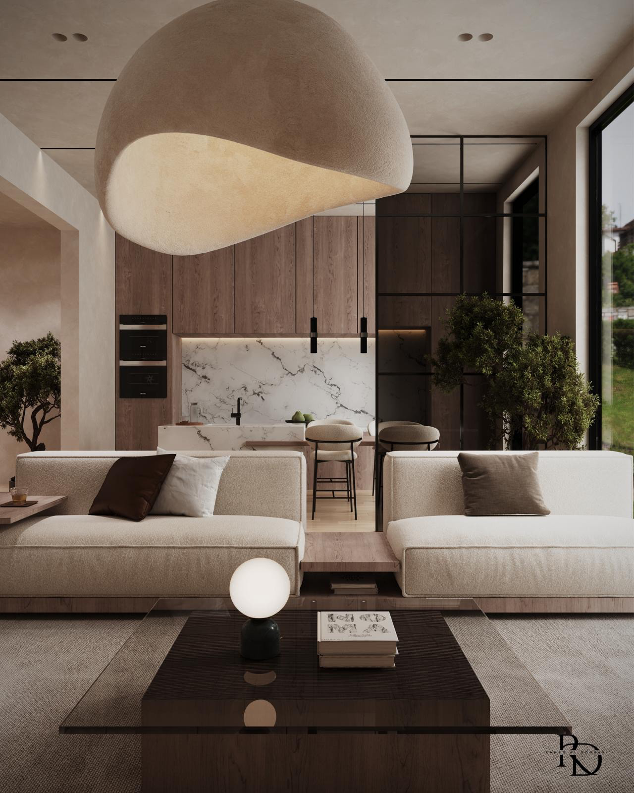 Residential Project | The Minimalist Japandi Living & Kitchen blends clean Scandinavian simplicity with the warmth of Japanese aesthetics. The design emphasizes open space, natural light, and a calming neutral palette. Soft wooden textures, marble finishes, and subtle curves create harmony between functionality and serenity, offering a modern yet timeless living environment.