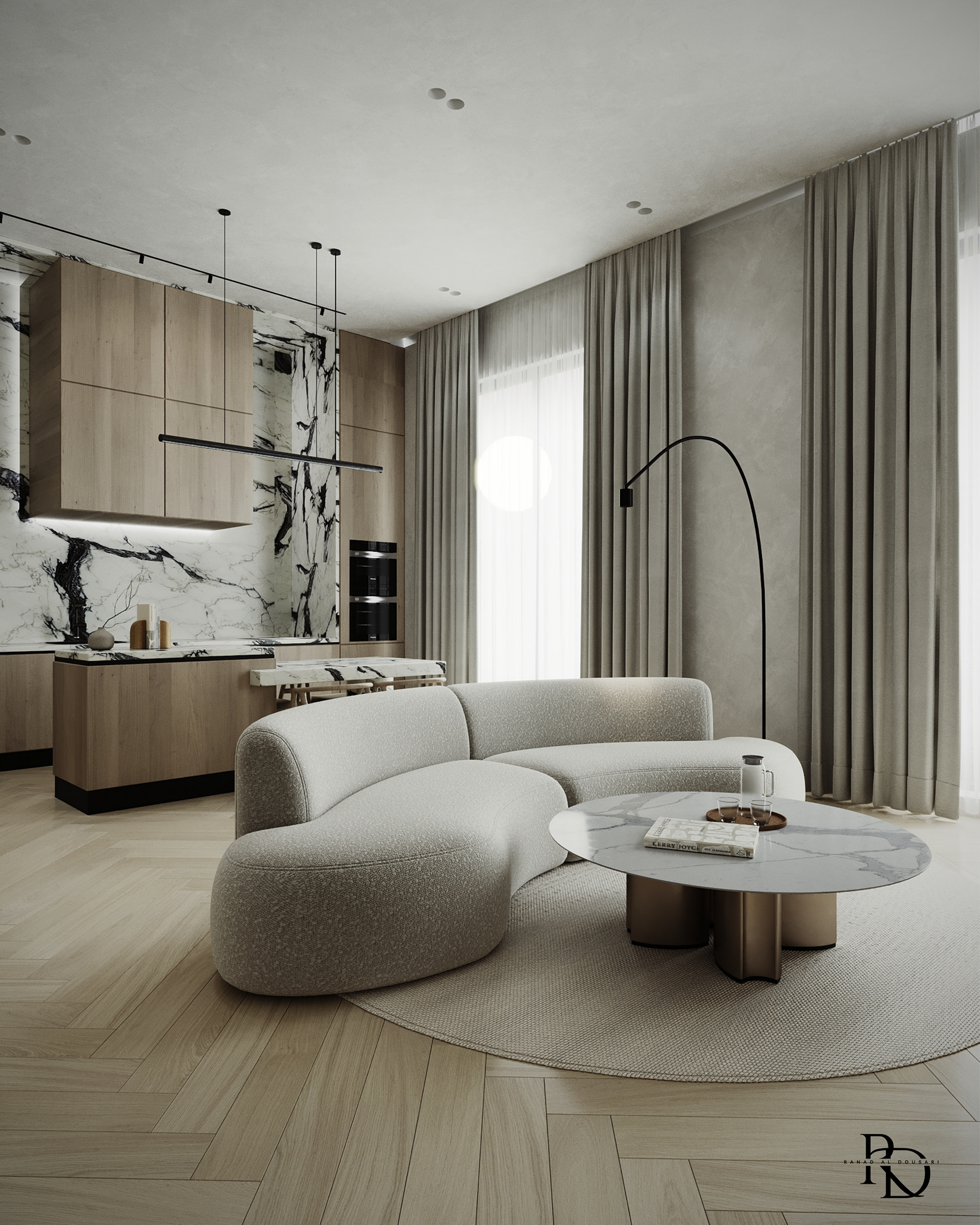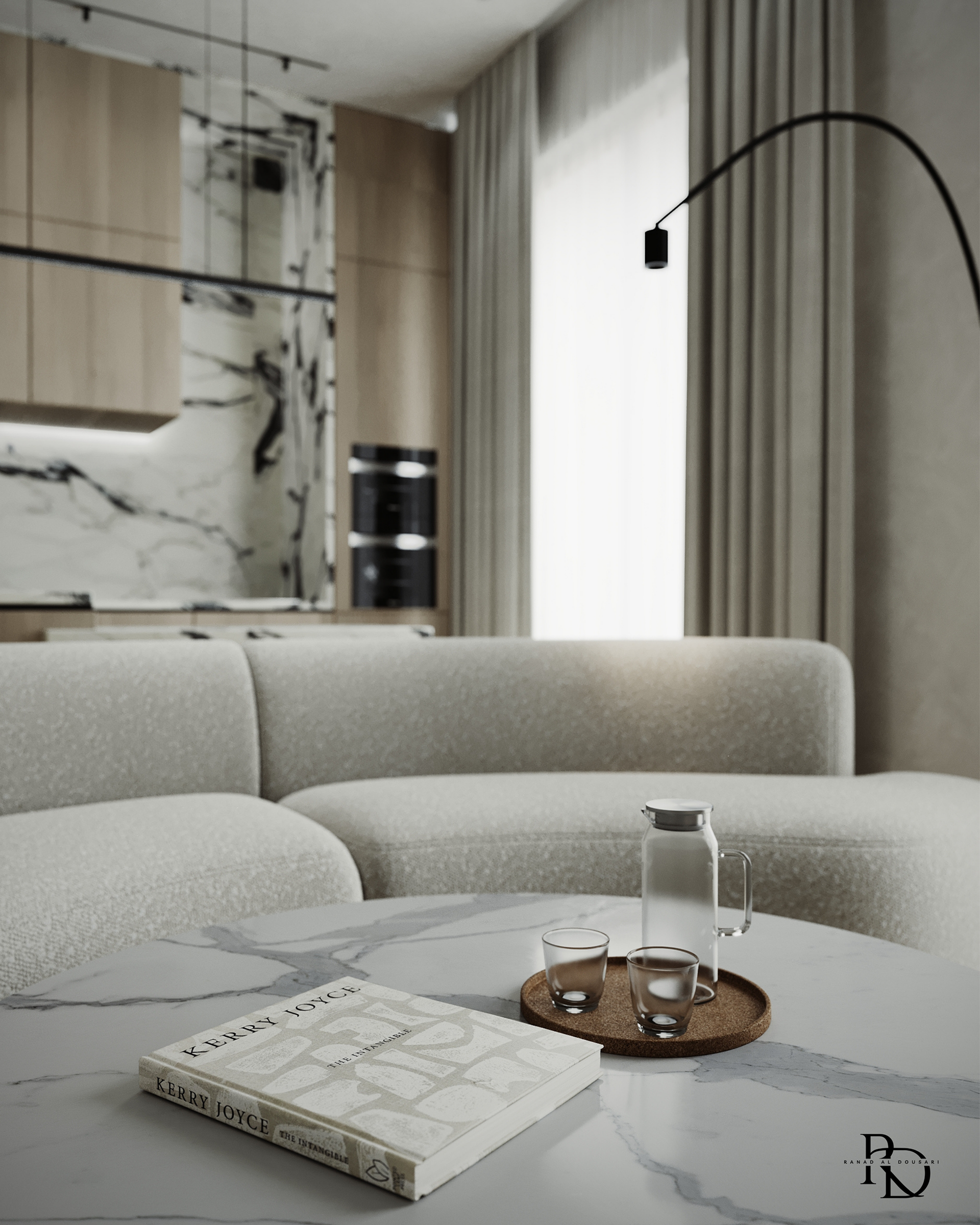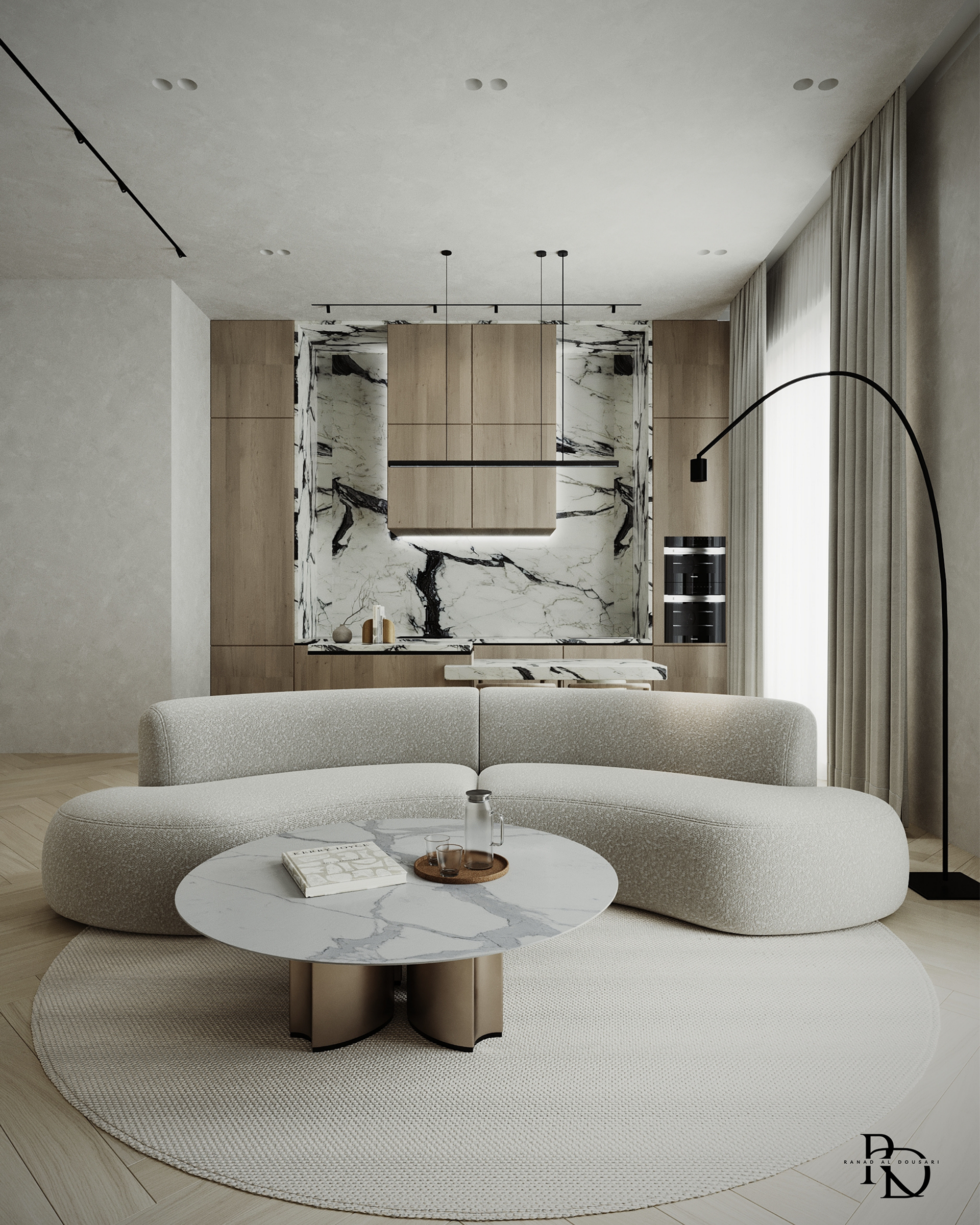 Residential Project | This interior explores a calm dialogue between soft minimalism and sculptural geometry. A muted palette of natural tones highlights the organic silhouette of the curved sofa, set against the bold veining of statement marble. Every element is thoughtfully curated to evoke balance, comfort, and quiet sophistication.