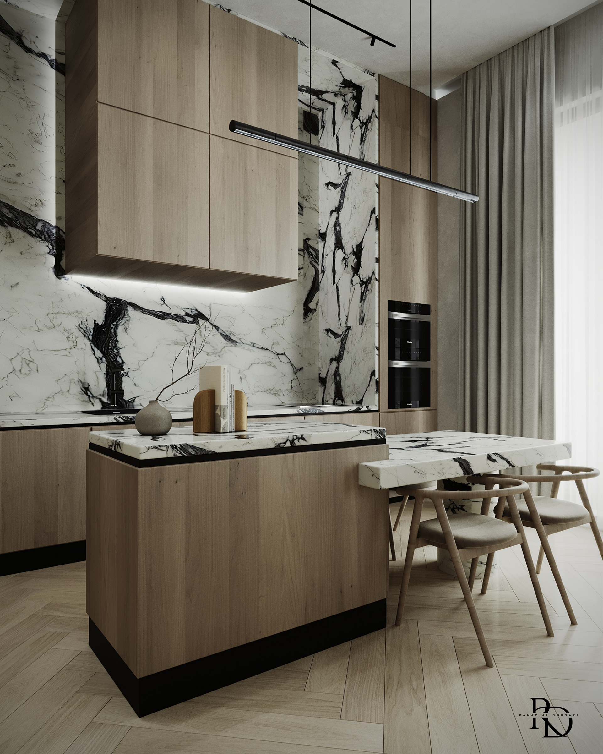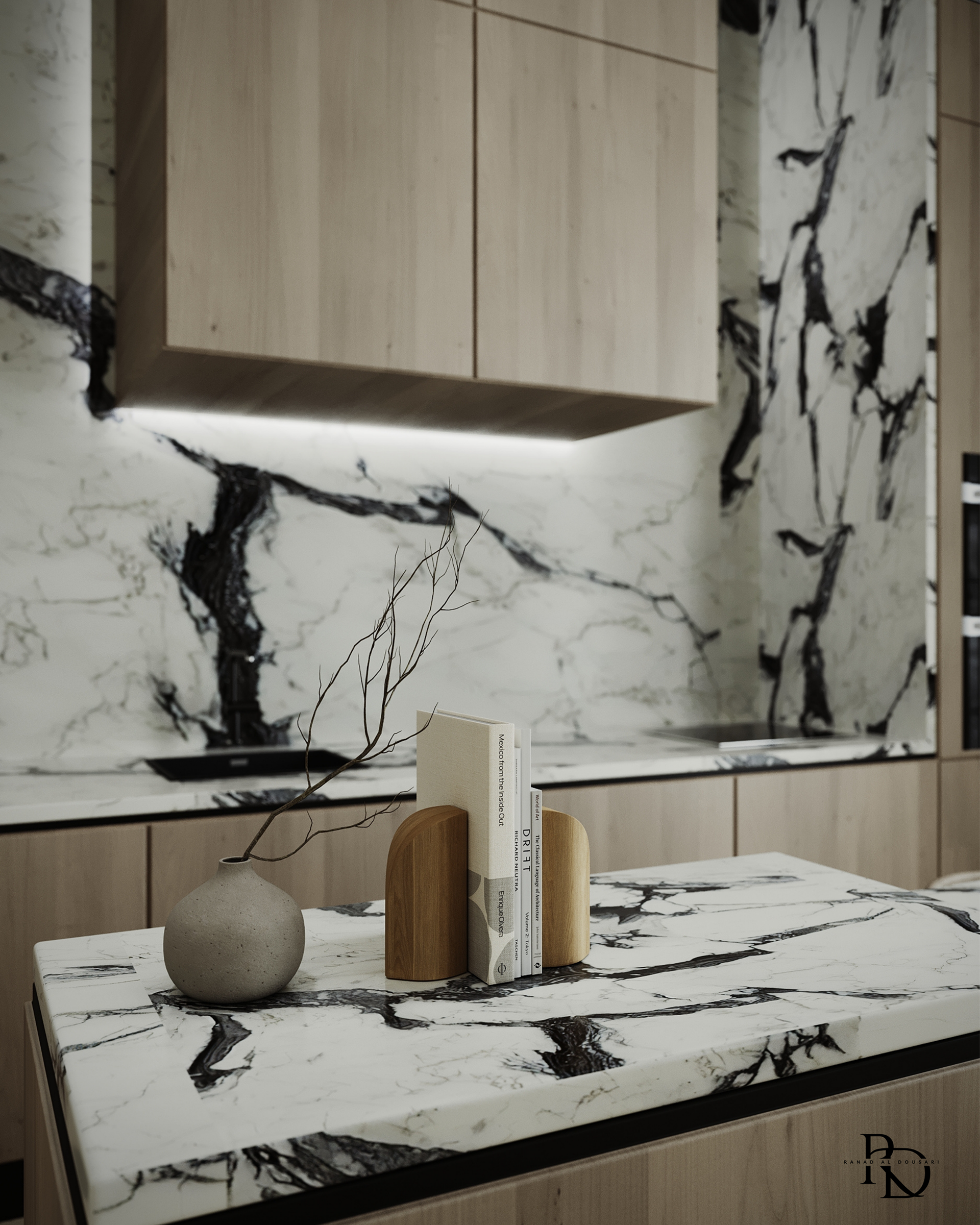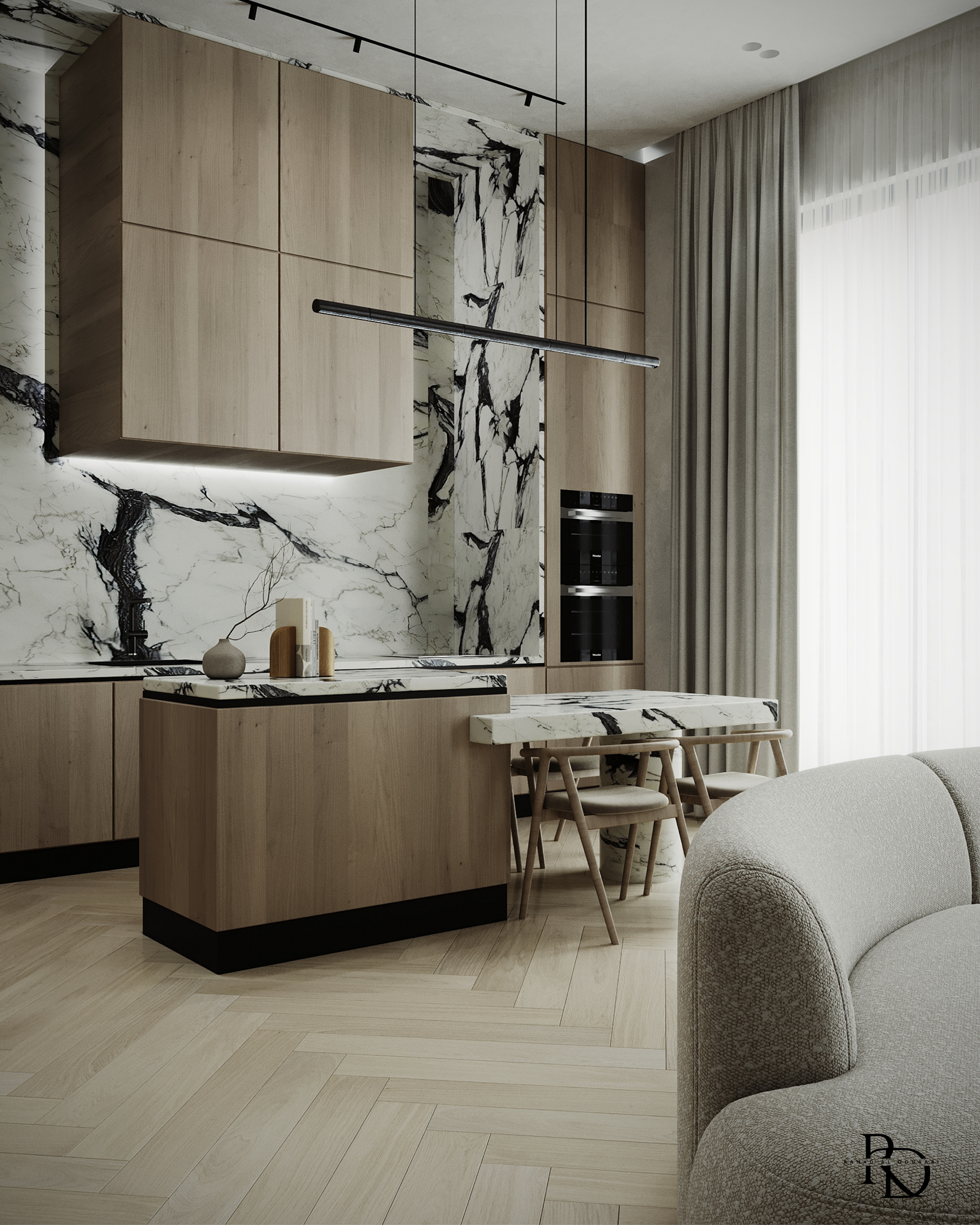 Residential Project | This interior explores a calm dialogue between soft minimalism and sculptural geometry. A muted palette of natural tones highlights the organic silhouette of the curved sofa, set against the bold veining of statement marble. Every element is thoughtfully curated to evoke balance, comfort, and quiet sophistication.